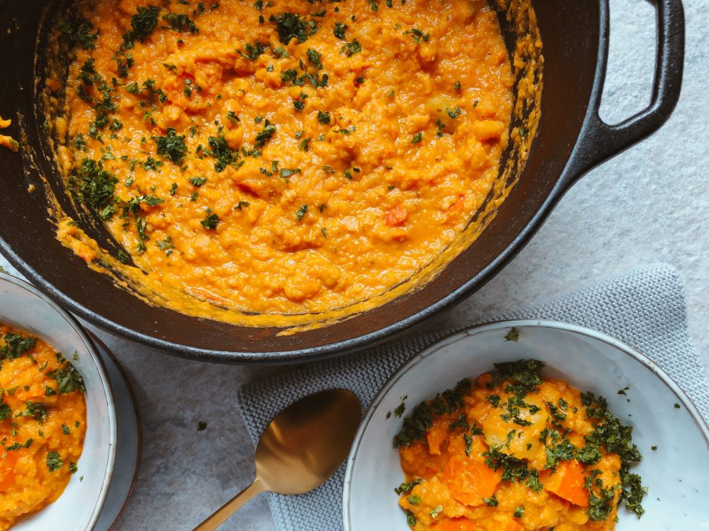 Durch den Kürbis und die Karotten wird dein Körper mit wertvollem Beta-Carotin versorgt, eine Vorstufe von Vitamin A, das unter anderem für gesundes Augenlicht sorgt. Zudem ist Beta-Carotin ein Antioxidans, welches unsere Zellen vor Schädigung schützt. Die Kichererbsen und die roten Linsen liefern jede Menge Ballaststoffe, die uns lange satt machen, den Blutzuckerspiegel kontrollieren und für eine gute Verdauung sorgen.